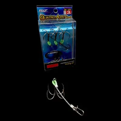 살짝 스치는 숏바이트에도 자동 훅킹되는 날카로운 네 개의 콰트로훅 구조이며, 미늘 없이도 랜딩 중 빠질 염려가 적도록 설계되었습니다. 야광 튜브를 적용해 대상어의 바이트 확인이 가능하며, 라운드형 듀어락 스냅과 고강도 투명 라인을 사용한 갈치 지깅용 어시스트 훅입니다.