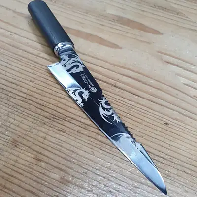 고급스런 용문양과 약 2.5mm의 두께 칼날로 단단한 가성비를 자랑하는 회칼입니다.