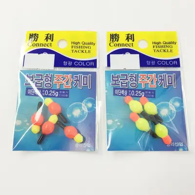 승리 보급형 주간 케미. 세련되고 정확한 무게로 주·야간 교체용으로 사용. 야간 케미 교체용으로 6Φ=0.18g, 8Φ=0.25g, 9Φ=0.28g 등 다양한 크기 선택 가능. 낚시터의 지형에 따라 색상 변경 사용.