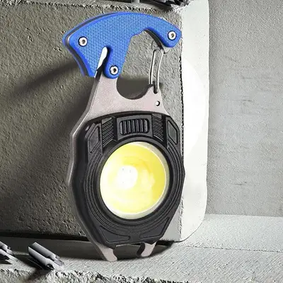다목적 멀티 미니랜턴. COB LED, 안전벨트 커터, 비상용 호루라기, 미니드라이버키트 등 7가지 모드 제공. 마그네틱 자석과 카라비너 기능으로 휴대성 우수.