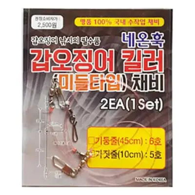 미들타입 갑오징어 킬러 전용 채비. 기둥줄(45cm) 6호, 가짓줄(10cm) 5호로 구성된 2단 채비. 롤링도래 사용으로 줄꼬임 방지.