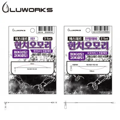 루웍스의 한치 오모리는 2가지 타입으로 1단 120cm / 천평채비 150cm 가 준비되 있고 채비의 안정적인 입수와 공격 성향이 강한 두족류 특화용으로 제작된 전용 채비입니다. 오징어 낚시의 최고의 라인 에스테르 라인을 사용하여 미세한 두족류의 입질을 알기 쉬우며, 라인의 직진성이 좋아 채비의 정렬이 원활하여 한치채비나 갑오징어채비등에 아주 좋습니다.