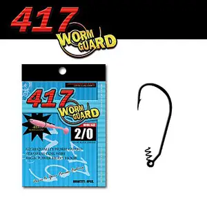 417 월가드의 특징은 라인아이에 장착된 코일스크류 웜 키퍼입니다. 코일 웜 키퍼의 홀드 능력은 아주 높아 사람의 손으로 당겨도 좀처럼 빠지지 않습니다. 노싱커 리그의 매치도 좋습니다. 또한, 기존의 옵셋 훅 와이어 자체를 굽혀 세트 하는 것으로 크랭크 부분에서 웜 홀드 하여 훅 포인트의 부분을 웜과 평행하도록 하여 밑걸림을 방지 합니다.