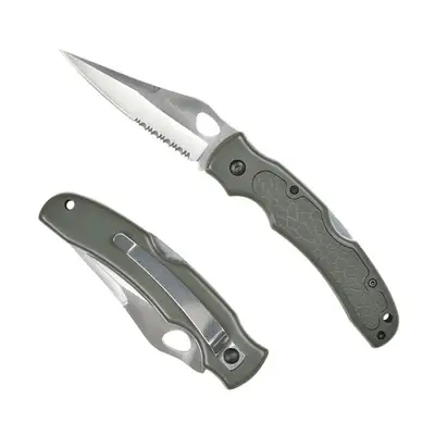 접이식 헌터 나이프(카키) 실버 블레이드. 블레이드의 두께는 3mm로 힘이 단단히 들어갑니다. 웨이브 블레이드(셀레이션 블레이드)는 물고기의 배를 나누거나 로프를 자르는데 유용합니다. 벨트 홈 첨부로 휴대성이 뛰어납니다.