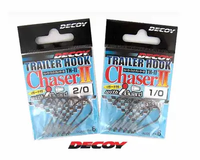 トレーラーフック・チェーサーニ. シャンクにセットされた「いガード」をアイにかぶせ、メインフックへセットするだけの楽々装着です。スピナーベイト等へはもちろん、トレブルフック、ジグヘッド等へもセットか可能です。