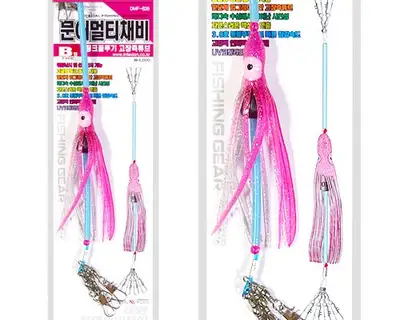 문어낚시용 멀티채비 B형. 핑크색 골뚜기 튜브와 고장축 튜브를 조합한 제품으로 자연스러운 액션감을 연출하며, 3.0호 봉돌 부착으로 빠른 침강 속도를 제공합니다. 고강력 인터락스 넓도래와 UV코팅 라인 40호가 포함되어 있습니다.