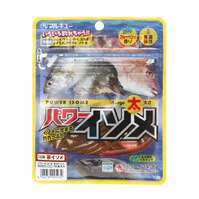 갯지렁이 형태의 성분해성 인조미끼 파워이소메. 물고기가 좋아하는 향과 맛을 적용했고, 바늘에 쉽게 꿰어 사용할 수 있는 15개입 웜 타입.