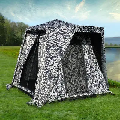 트라이캠프 자동 낚시텐트 FO-14MF. 무결로 투습원단 적용으로 결로 방지, 4면 출입구, 2Way 대문/소문 구조, 원터치 조인트, 7.5kg 무게. 전면 턱 없음, 70% 암막 이너텐트, 블랙코팅 플라이.