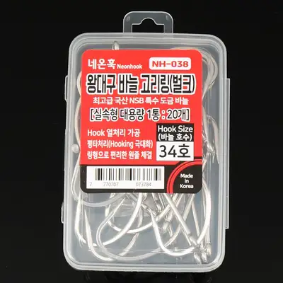 최고급 국산 NSB 특수 도금 바늘 채용. HOOK을 열처리 가공하여 내구성을 높임. 평타처리 가공으로 훅킹력을 극대화시킴. 링형 고리로 원줄 체결이 편리함. 실속있는 대용량(20개입)으로 효율성 및 경제적 UP!