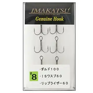 IMAKATSU Genuine Hook. 순정 트레블 훅으로 각 사이즈별 적합 미끼 정보는 패키지 표면에 기재.