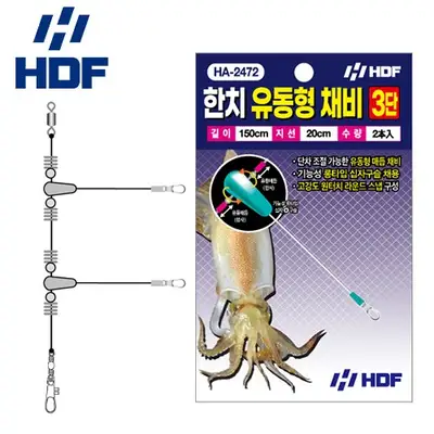 한치 유동형 채비. 필드 상황에 맞게 단차 조절이 가능한 유동형 매듭 채비이며, 지선의 길이를 한치의 입질 상황에 맞게 조절할 수 있다. 기능성 롱 타입 십자구슬을 채용하여 채비의 꼬임을 줄이고, 고강도 원터치 라운드 스냅 구성으로 루어의 자연스러운 움직임과 탈착 편의성을 높였다. 개별 포장 제품이다.