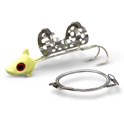 텐야에 연결된 고리로 생미끼의 고정과 교환이 간편한 문라이트의 원터치텐야입니다. 강력한 축광기능과 레드아이 헤드를 적용했고, 생미끼를 확실하게 고정시키는 미끼 고정용 바늘과 스프링형 고리 키퍼가 특징입니다.