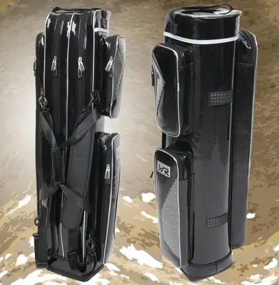 민물 낚시용 가방으로 카본 패턴 원단 사용, 유광 바디, 발수 처리된 밑면, 내부 파티션 수납, 측면 로고 디자인