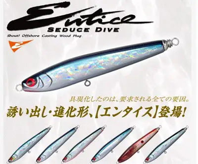 Shout! Offshore Casting Wood Plug. 具現化したのは、要求される全ての要因。誘い出し・進化形、【エンタイス】登場! 바닥에서 미들 레인지 대상도 유인 다이브 & 다트 액션. 거품을 당기면서 다이빙, 수중 독 워크를 만들어내는 형상과 부력. 발군의 비거리를 창출하는 무게 균형.
