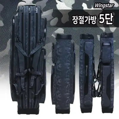 장절로드 수납이 가능한 긴 사이즈 민물낚시대가방. 5단 구조로 중앙 4줄, 양사이드 2줄의 다목적 끈 장착. 고급레자(밀리터리 무늬패턴) 원단, PVC 바닥 구조, 강화 플라스틱 고리 등 실용적인 디자인.