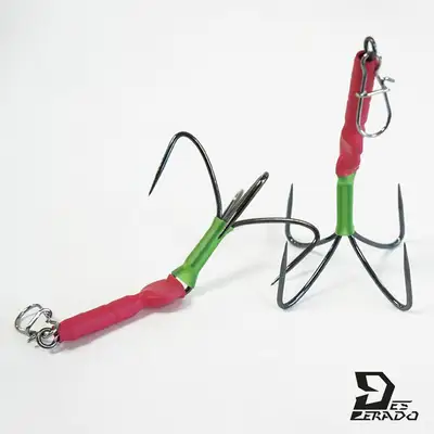 회전도래가 달려 있는 갈치지깅 전용 무미늘 바늘. 회전도래가 달려 있어 갈치를 걸어 올릴때 라인 트러블을 해소시켜주며 훅이 메탈을 올라타는 경우도 막아줍니다. 튜브 속의 트리플 도래는 어시스트의 역할 범위를 넓혀주어 바늘이 주변의 갈치를 걸어 올릴 수 있는 확률을 극대화 하였습니다. 1.야광 튜브를 바늘목에 장착하여 정확한 바이트를 받도록 유도하였습니다. 2.루어 전용 고강도 스냅을 장착하여 채비 교체를 쉽게 하였습니다. 강한 바늘은 강도가 15kg 이상의 인장 강도를 보유하고 있어 손님 고기로 잡히는 다랑어류나 대삼치 같은 비대상 어종도 가뿐히 랜딩이 가능하게 되었습니다.